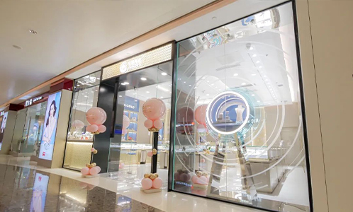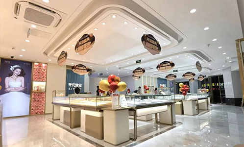當時尚靈感與經典風情相遇,你所能想象到的精致格調、浪漫情懷,都在這里進發而出一KINME開元珠寶 簡約大氣的菱形元素,以對稱、連續的和諧韻味,契合品牌一貫的風格調性,在門頭造型中,富有層次感秩序感,營造出永恒優雅的氣質,提升高貴雋永之美。